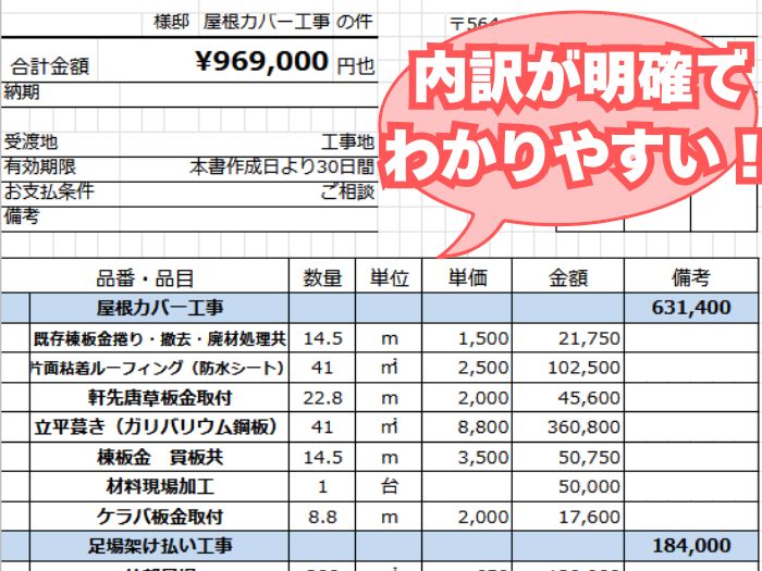 信頼できる業者を見極めるには、見積もり書の「透明性」が命です。高額な工事だからこそ、不透明な見積もりで高額請求する業者には細心の注意が必要です。